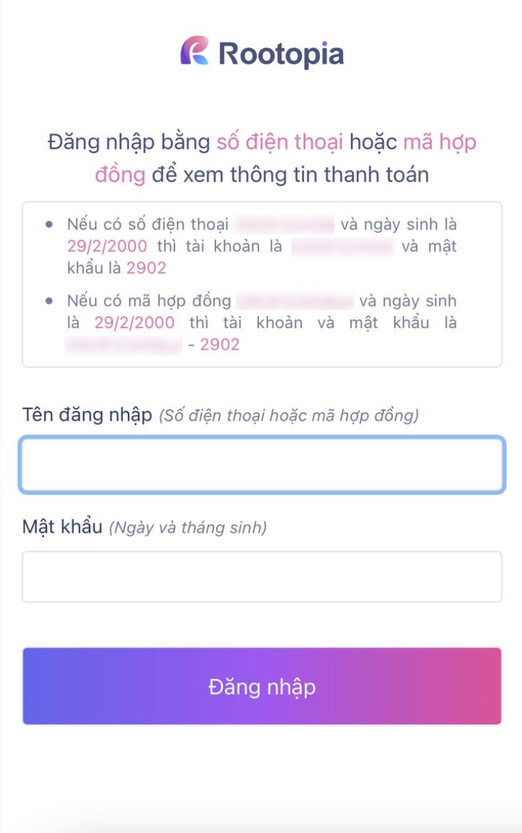 Màn hình trên được gọi là màn hình đăng nhập, Quý khách vui lòng nhập SĐT là Tên đăng nhập còn Mật khẩu sẽ là ngày và tháng sinh