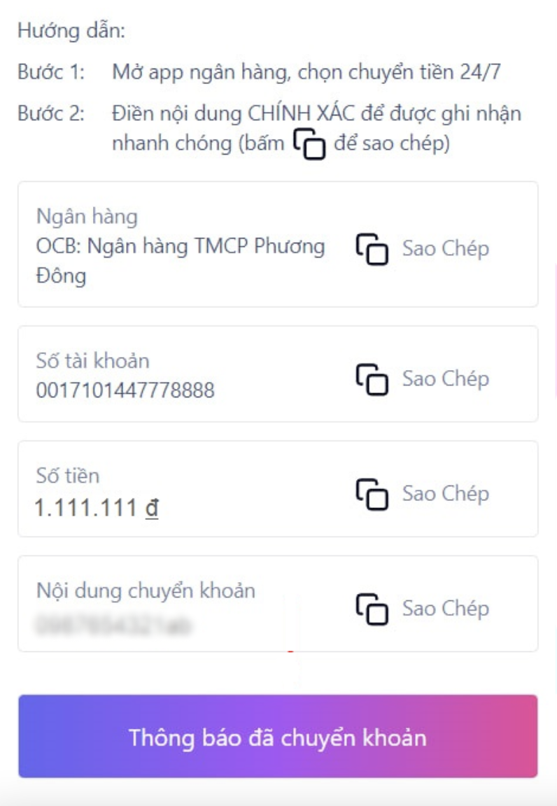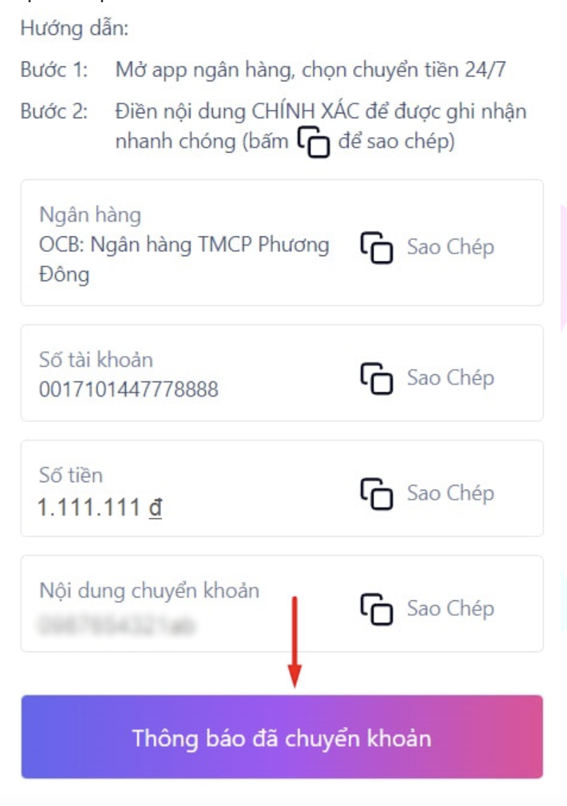 Bước 4: Chuyển khoản đúng thông tin theo hướng dẫn thanh toán
